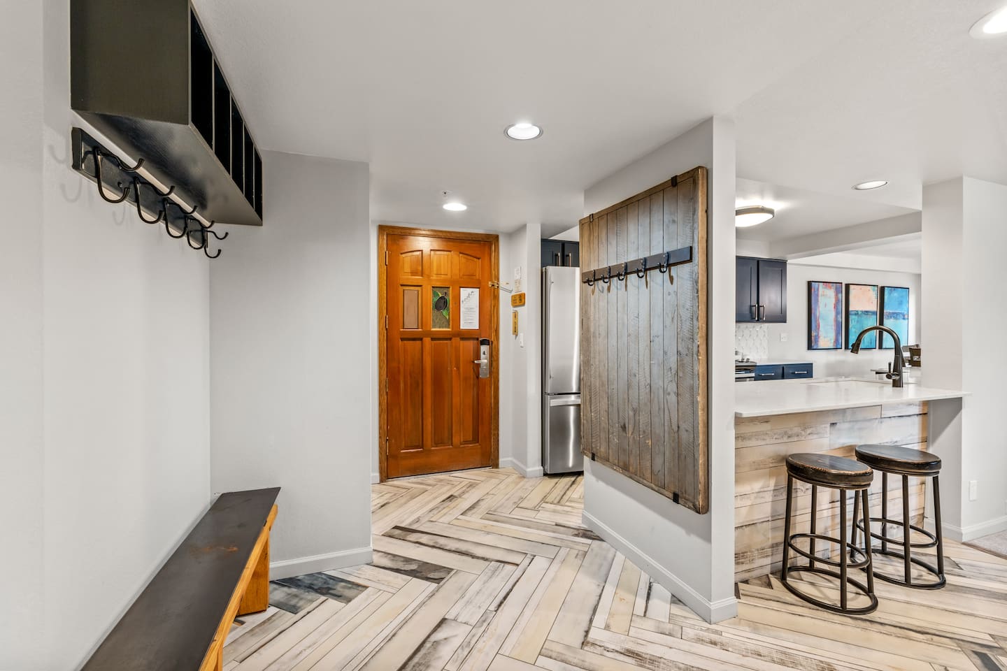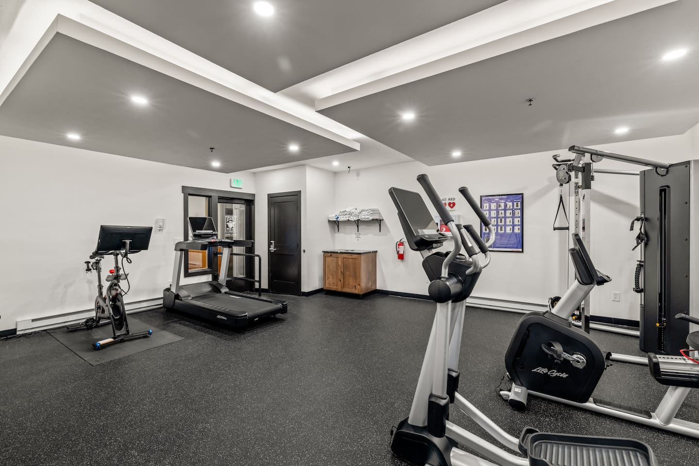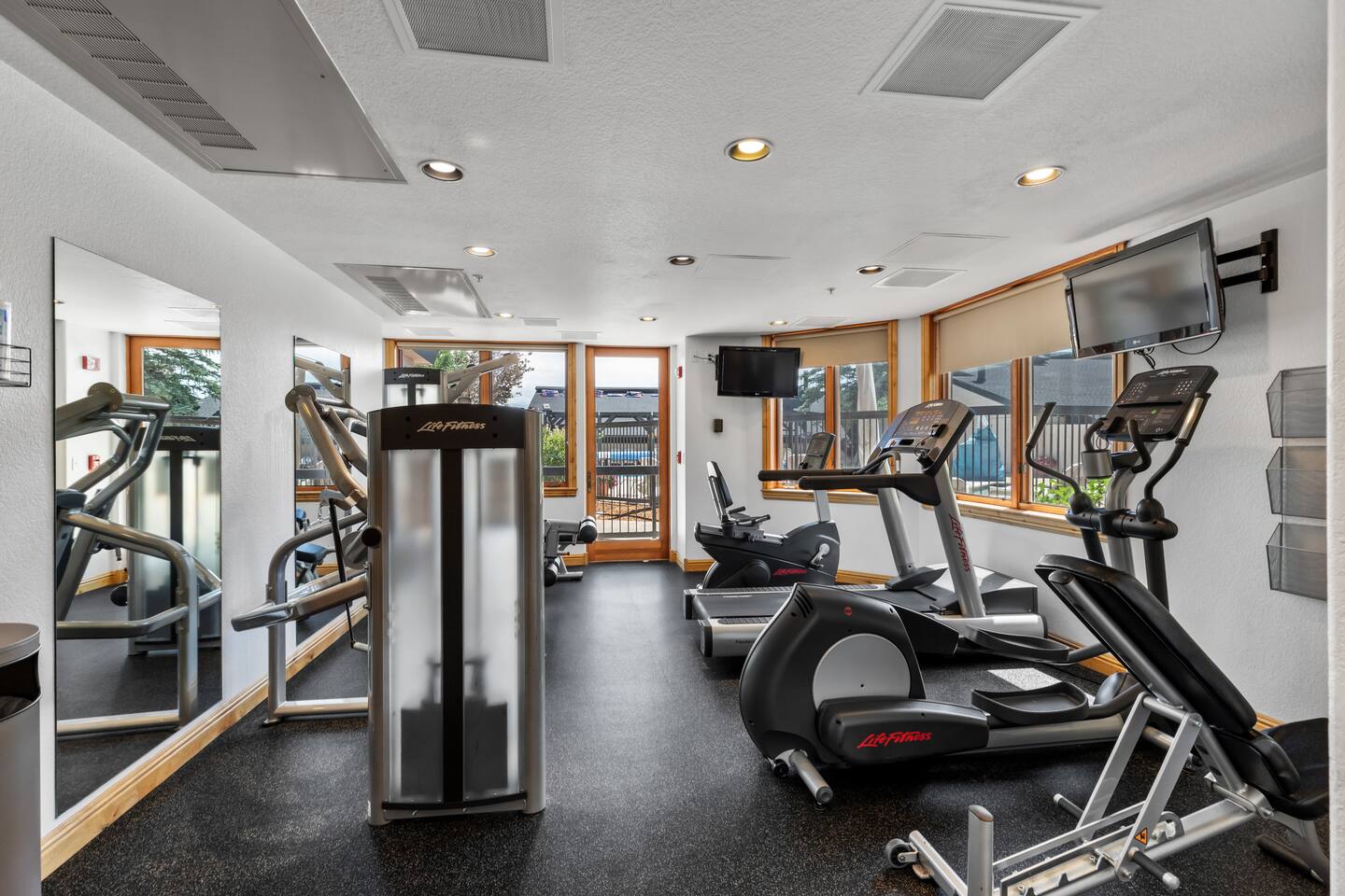 There are several ways to access our building easily, garage access two floors below the room with elevator service, a private entrance to the street, direct access to the plaza with a heated sidewalk, stores, restaurants, and access to the creek and ski/bike mountain one floor down. You can use the lobby next door for key retrieval and to address any other questions. You will have a private ski locker, access to the pool with towels, and two exercise rooms open year-round.