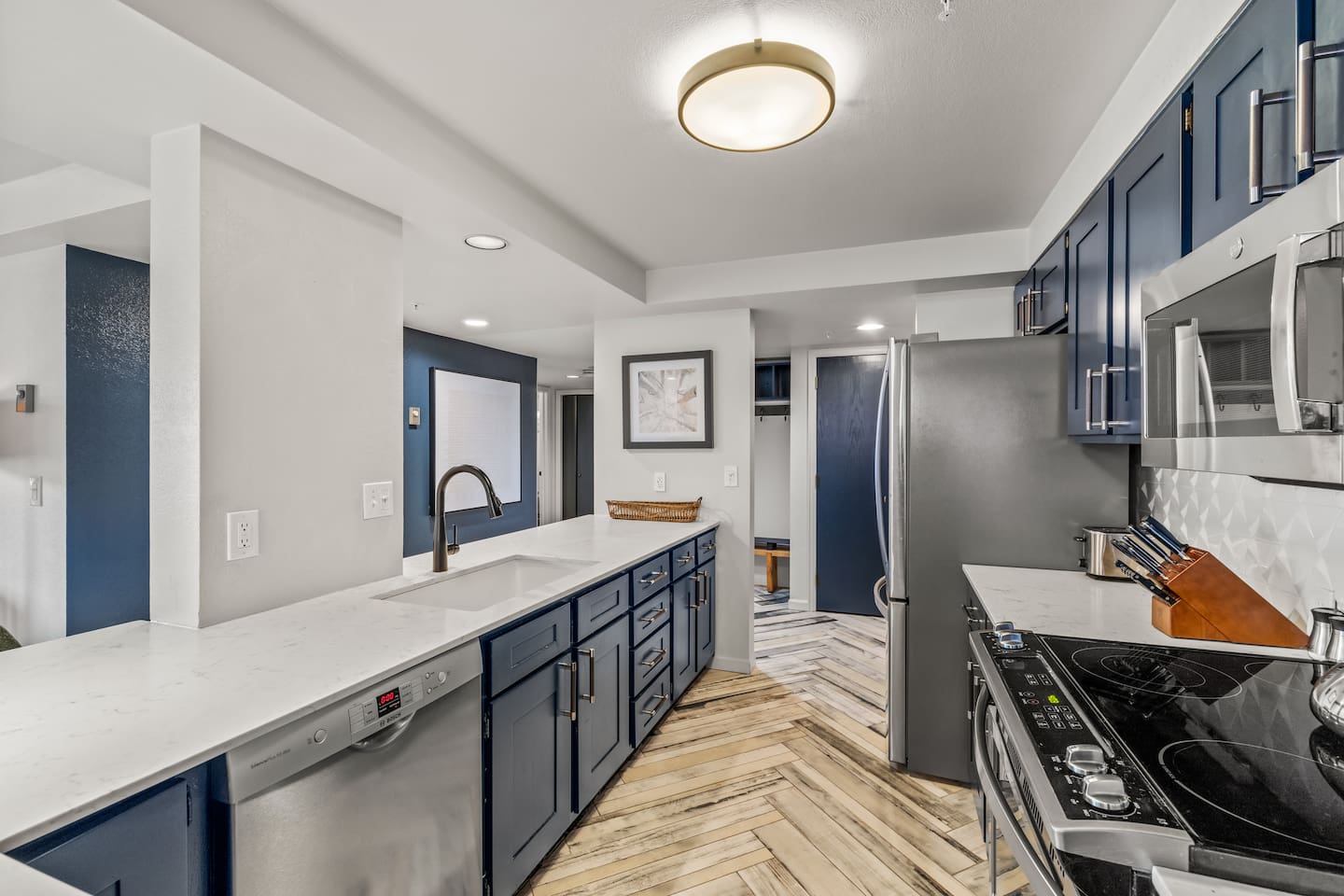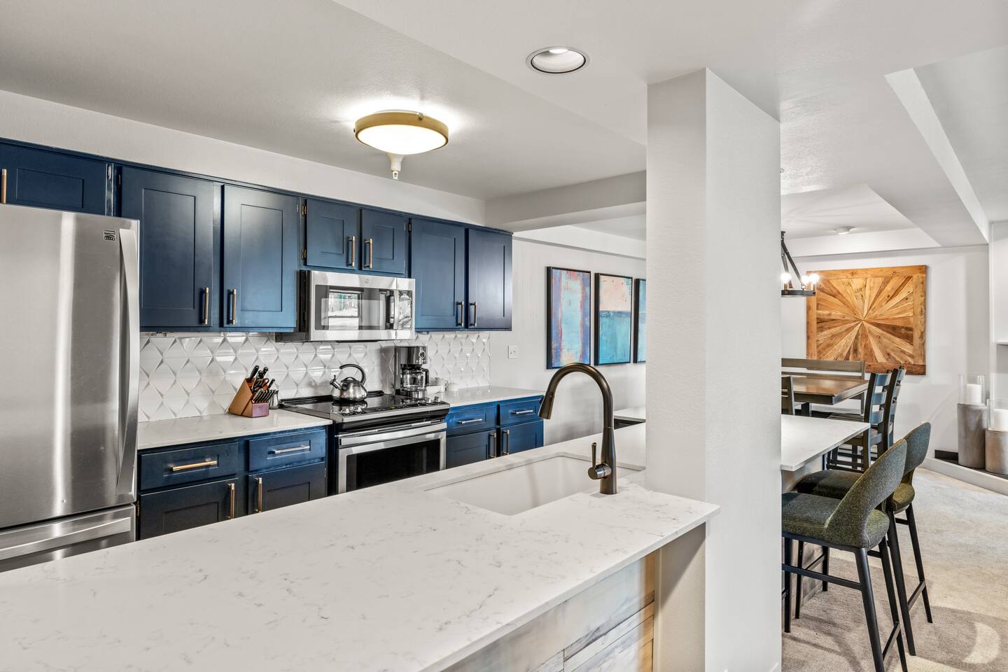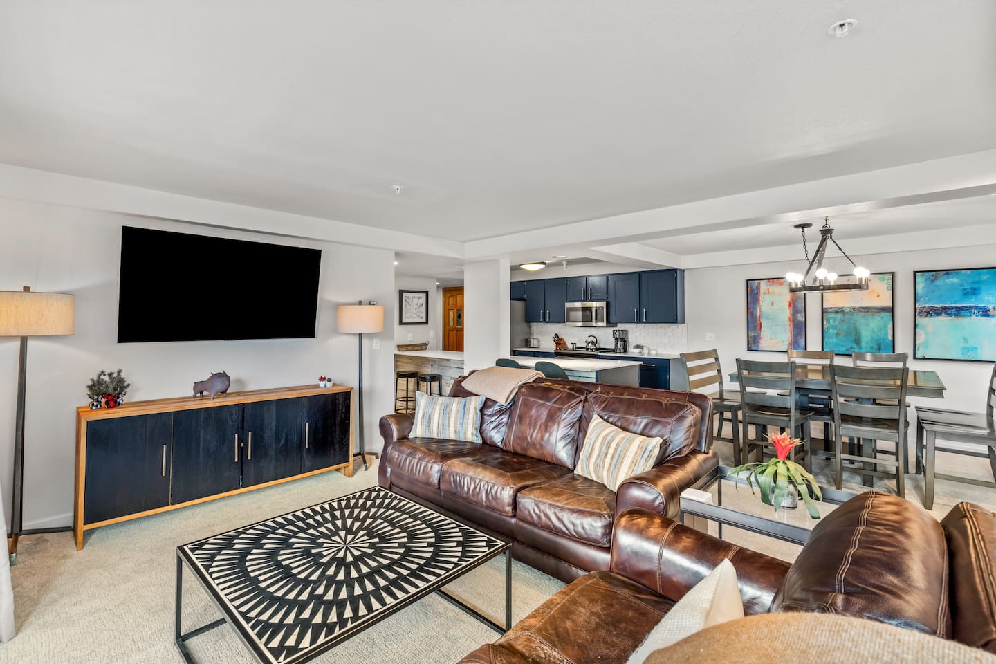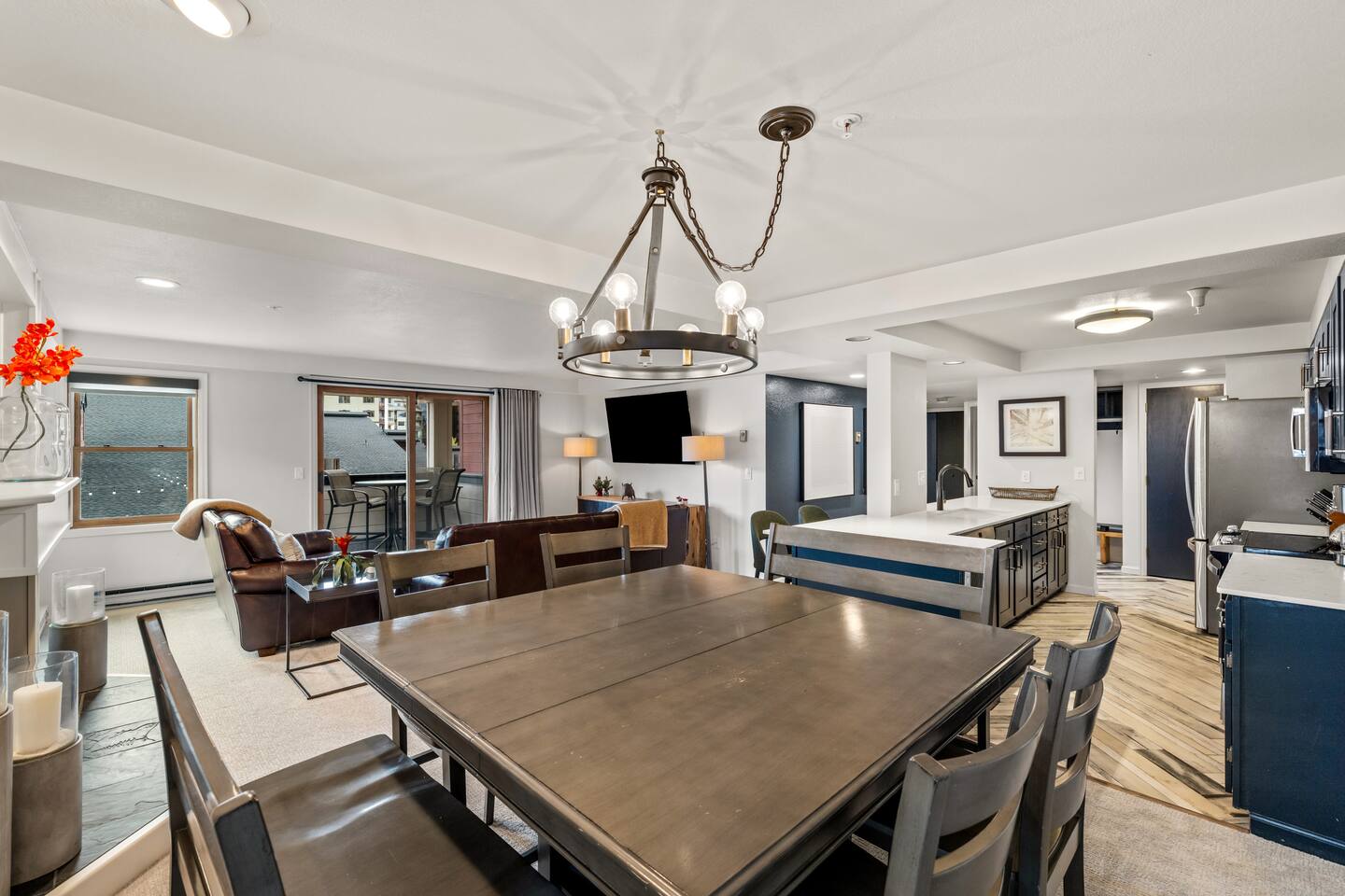 New listing!! King master suite with en-suite bathroom. The 2nd bedroom features a roomy full-over-full bunk bed. Sofa bed in the living room. Open kitchen/living area with bar seating for 4, dining table seating for 8. You’ll love the modern décor and remodeled kitchen and bathrooms. The balcony view of the courtyard and slopes will make you feel like you are not missing a moment on the mountain!